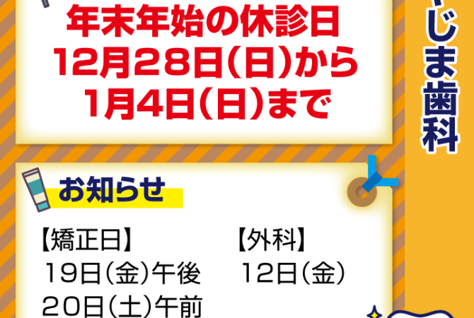 2025.12.2 ブログ 保険でできる白いつめもの「CR(コンポジットレジン)」とは? 詳しく見る 2025.11.27 ブログ 12月休診日情報 詳しく見る 2025.11.5 ブログ その1本が歯の寿命を縮める!?喫煙と歯周病の関係 詳しく見る 2025.10.21 ブログ 中秋の名月 詳しく見る 2025.10.2 ブログ 歯を守れば脳も守れる!認知症対策はお口から 詳しく見る 2025.9.24 ブログ 10月休診日情報 詳しく見る 2025.9.2 ブログ 子どもに多い!唇の裏の水ぶくれ、放置しても大丈夫? 詳しく見る 2025.8.22 ブログ 9月のお知らせ 詳しく見る 2025.8.21 ブログ 暑くても好きな夏 詳しく見る 1 / 2 ページ2次へ »
